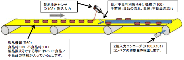 コンベア上を流れてきた製品を、製品検出センサ(X108)で認識し、割込みプログラム(INTPG10)を実行します。
