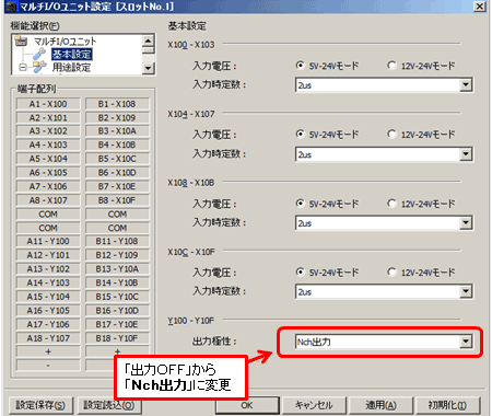 「オプション」→「マルチI/Oユニット設定」→「基本設定」にて出力極性を「Nch出力」に変更します。
