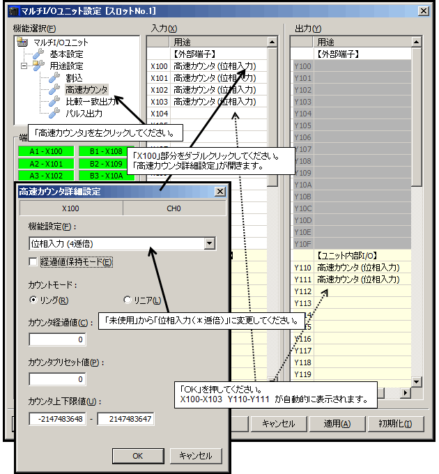 「オプション」→「マルチI/Oユニット設定」→「高速カウンタ」にて詳細を設定します。