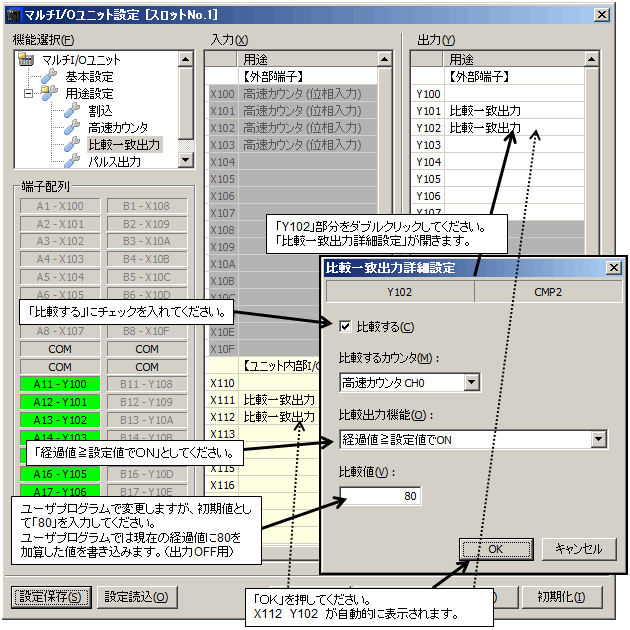 「オプション」→「マルチI/Oユニット設定」→「比較一致出力」にて詳細を設定します。