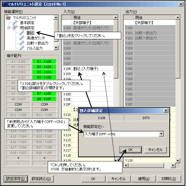 「オプション」→「マルチI/Oユニット設定」→「割込」にて詳細を設定します。