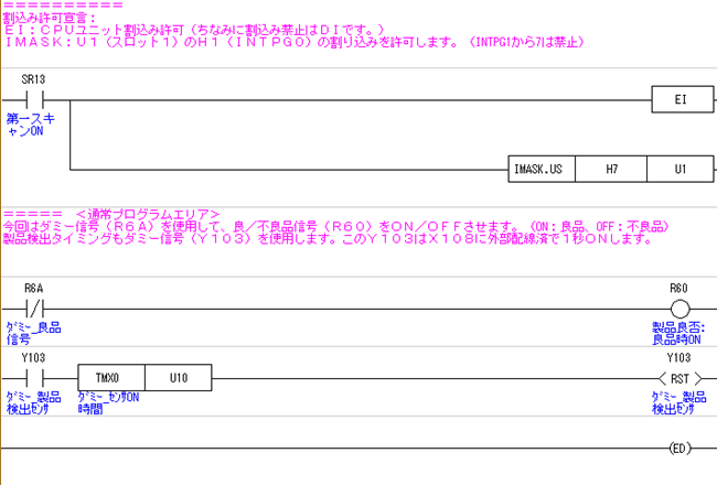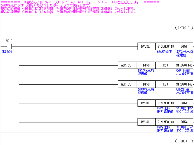 割込みプログラム内で、現在のエンコーダの経過値(UM110)をDT50に代入し、振り分け機構(Y100)動作タイミングである現在の経過値から50プラスした値(UM146に代入)と、振り分け機構(Y101)動作終了タイミングである現在の経過値から80プラスした値(UM148)をセットします。