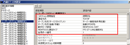 | ※ | オートコネクション機能を使用する場合は、ET-LANユニット(裏側)の設定モードスイッチ2を"ON"にし、かつ"コネクション1~8をラダーで設定する"にチェックがない状態で設定ください。(下記参照) |