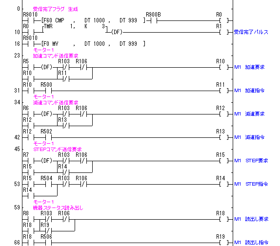 送信要求が複数個同時に発生した場合は自動的に順番を決め送信します。加速・減速・STEPコマンドは要求信号の立ち上がりを検出して送信しす。読出しコマンドは要求信号がONしている間、常に送信します。