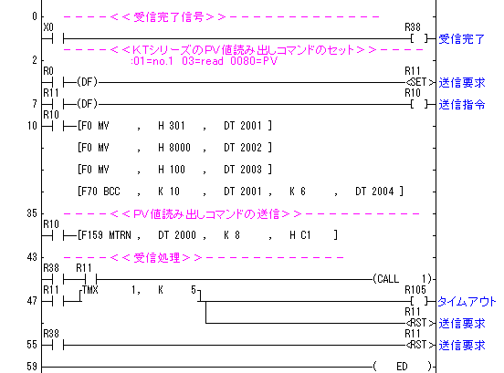 MCUからKTシリーズの現在温度(PV値)を読み出します。R0をONすることにより読み出しコマンドを送信します。