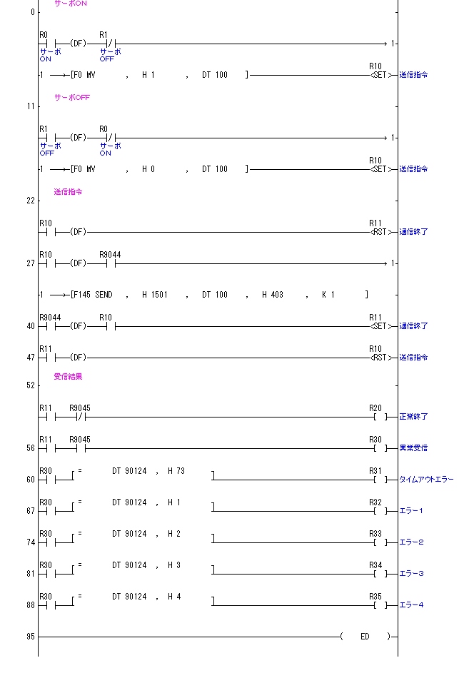 R0をONすることでサーボONするコマンドをMODBUSスレーブアドレス01のSCON-CAへ送信します。