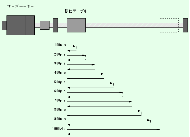 移動量100パルス~1000パルスまで100パルスずつ増加させ、往復動作させます。