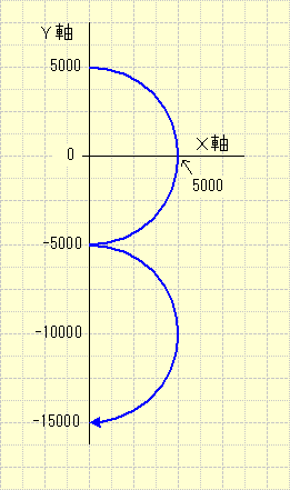 始点(X=0、Y=-5000)から通過点(X=5000、Y=-10000)を通って