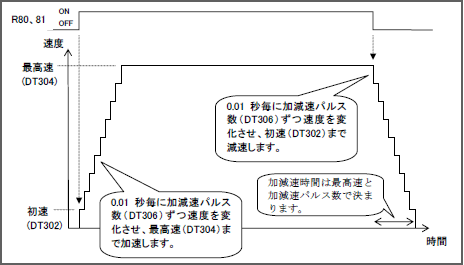 そこで、起動時と停止時にJOG速度を0.01秒毎に変化させ、加減速付JOG運転を実現しました。