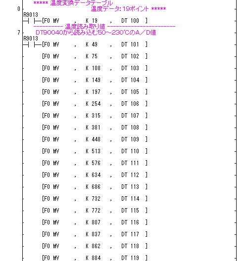 サーミスタ入力からのA/D変換値と温度の関係は、直線的な特性ではありませんので、四則演算だけでは温度の値を算出することができません。そこで、この事例では、F282(スケーリング)命令を使用し、温度の値を算出しています。10℃ごとに区切った19段階のデータテーブルを作成し、スケーリングを行っています。