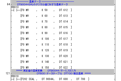 スケーリング命令を使用し、DT90044のデジタル値を温度データに変換しています。