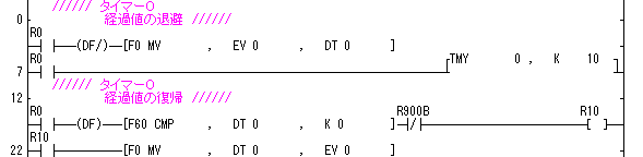 タイマー命令は起動条件が一度OFFすると、経過値はリセットされるので、前の経過値のつづきからスタートすることはできません。このプログラムでは、前回の経過値を覚え、次のスタート時にその値から数えます。