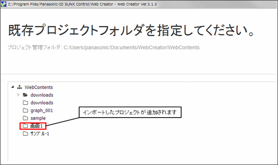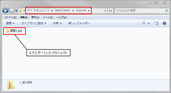 1.Control Web Creatorのエクスポート機能にて出力したプロジェクトデータ(フォルダ3階層すべて)をエクスプローラー等を使い「Imports」フォルダへ格納します。フォルダは「マイドキュメント - WEBCreator - Imports」へ作成されています。